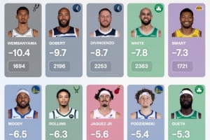 本季在场/不在场半场防守效率差:文班第1 戈贝尔第2 刚哥穆迪上榜