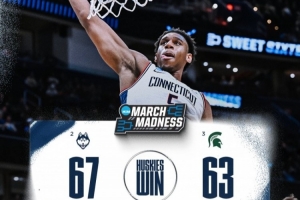 体育资讯3月28日讯 NCAA疯三16进8,康涅狄格大学67-63险胜密歇根州立大学,晋级16强。