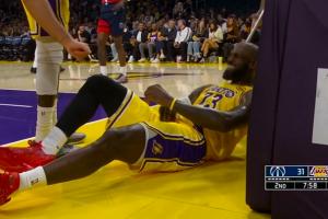 詹姆斯突破倒地左手有些不舒服 起来跟裁判示意被打手了