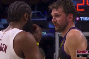 哈登和东契奇在场上愉快聊天 还捂着自己的胡子😂
