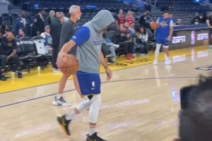 又来赛前热身啦!小吧赛前见到库里状态不错 目标下场打火箭复出