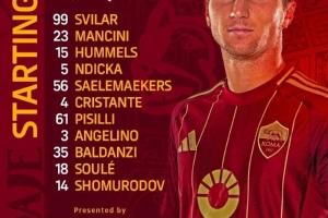 罗马首发:99-斯维拉尔 、23-曼奇尼、15-胡梅尔斯、5-恩迪卡、56-萨勒马科尔斯、61-皮西利、4-克里斯坦特、3安吉利诺、18-苏莱、35-巴尔丹齐、14肖穆罗多夫