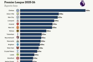 切尔西在本赛季支付了6510万英镑的经纪人费用,连续第三个赛季领跑俱乐部榜单。2025-26赛季,切尔西占到了英格兰足球联赛92家俱乐部经纪人总支出的12%。