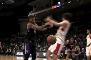打急眼了?杨瀚森扣篮后被丹尼斯一把推倒 吐舌微笑回应