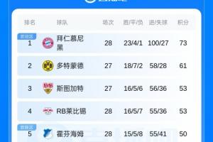 还剩6轮!德甲积分榜:拜仁积73分居榜首,先赛12分优势领跑
