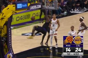 詹姆斯背靠背出战首节4中4已经爆砍14分 双手炸筐打停太阳