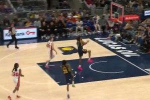 这球是真滴酷!奥比·托平反击胯下单臂暴扣!但先超时了!