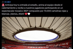 马竞官方写道:“今天请提前进入球场!从热身阶段就开始为球队呐喊助威,并参与由70000张红白卡片组成的壮观360度环绕马赛克拼图,以此迎接我们的球员入场。”