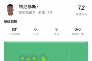 体育资讯2月27日讯 正在进行的国王杯半决赛首回合,皇马客场1-0领先皇家社会。此役维尼修斯首发83分钟被换下,球员全场重点数据如下↓