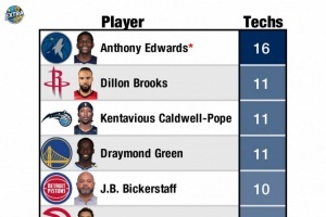 华子16次遭停赛!本赛季技犯榜:狄龙&追梦11次第二 活塞主帅10次