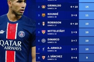 体育资讯3月1日讯 德转盘点了本赛季五大联赛后卫球员在各项赛事中参与进球榜,其中阿什拉夫居首,孔德、阿诺德等在列,具体榜单如下: