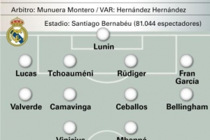 体育资讯1月16日讯 北京时间周五凌晨的国王杯1/8决赛,皇马将和塞尔塔交手。《世界体育报》对本场比赛皇马的首发阵容进行了预测,维尼修斯和姆巴佩组成双前锋,卢宁把守球门。