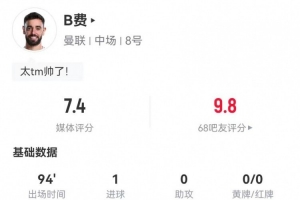 体育资讯3月10日讯 曼联在本轮英超1-1战平阿森纳,B费本场数据如下: