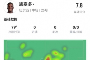 体育资讯3月14日讯 切尔西在本轮欧协联1-0领先哥本哈根,凯塞多本场数据如下: