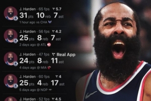 退步到啥时候了?哈登近8战场均29分6.6板10.1助 包括单场50分