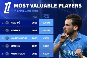 体育资讯1月18日讯 官方消息,巴黎圣日耳曼从那不勒斯引进边锋克瓦拉茨赫利亚,双方签约至2029年。据罗马诺报道,这笔交易的转会费超过7000万欧。德转也在社媒发布了法甲历史前10身价的球员排行榜,前十均是巴黎圣日耳曼球员。
