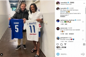 目前效力于哈伊杜克的拉基蒂奇社媒晒出与孔德互换球衣的照片,配文:“很高兴见到你,我的兄弟孔德,祝你在本赛季余下的比赛中好运!”
