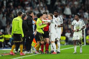 比赛加时赛下半场,奥拉萨加斯蒂铲翻维尼修斯,双方发生冲突。其中,莫德里奇被拍到锁喉久保建英。