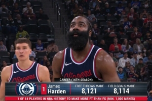快船后卫哈登罚球命中数8212个,而他的运动战进球数有8114个。