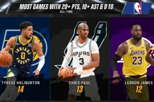 20分10助0失误场次前三:哈利伯顿14次居首 保罗与詹姆斯分列二三