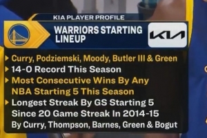 库里、波杰姆、穆迪、巴特勒和格林的首发阵容本赛季战绩14胜0负,创联盟本赛季纪录;