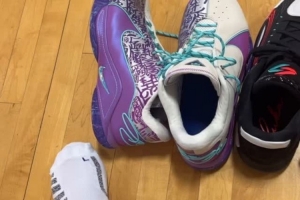 詹姆斯首先自拍晒出训练中他和东契奇各自的球鞋。