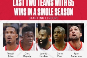 他们也成为2017-18赛季火箭后首支65胜球队,当时火箭的首发阵容为:阿里扎、卡佩拉、哈登、保罗和莱恩-安德森。