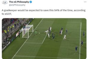 数据机构The xG Philosophy赛后发布统计数据指出,曼联这次丢球中,根据的对手的射门质量,守门员应有94%的概率将这球救下。然而奥纳纳致命脱手最终导致丢球。