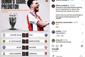体育资讯4月15日讯 今晚凌晨,欧冠1/4决赛次回合战火重燃。媒体90min预测了这四场比赛的赛果,90min表示阿森纳将淘汰皇家马德里,而阿斯顿维拉本赛季的欧冠征程也将就此终结。