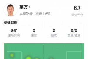 体育资讯4月16日讯 欧冠1/4决赛次回合,巴萨客战多特,莱万首发出战,0射门0射正,送出1次关键传球,评分6.7。