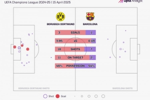 OPTA统计表明,本场比赛,巴萨预期进球数0.49,多特预期进球数3.85,两队预期进球差达到-3.36,创造了2024-25赛季欧冠淘汰赛的最高纪录。