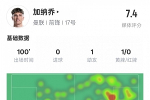 体育资讯4月18日讯 欧联杯1/4决赛次回合,曼联主场迎战里昂,加纳乔首发出战,4次过人成功,贡献出1次助攻,送出3次关键传球,也错失1次进球机会,评分7.4。