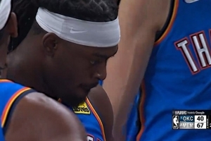 比赛第二节,雷霆球员多特在防守时失衡撞翻飞在空中的莫兰特,后者正面平拍倒地,目前已经返回更衣室。