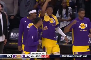 23年湖人40分大胜淘汰灰熊,湖人板凳席全在跳舞,唯独老詹独自提前走入球员通道