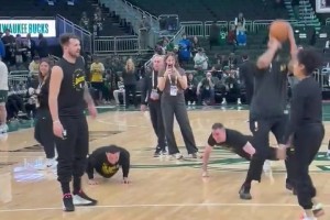 队霸实锤😆东契奇热身中场三分 又让助教们做俯卧撑减肥啦!