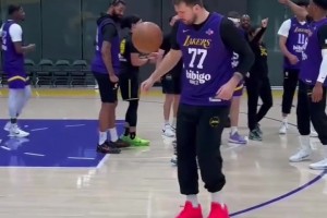 东契奇训练中展示足球技巧 头球助攻自己命中三分球!