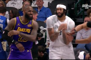 注意点影响!🤣老詹&海斯又在场上和浓眉打情骂俏!