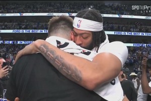 聊了啥?重磅交易两大主角东契奇与浓眉 赛后拥抱致意&耳语