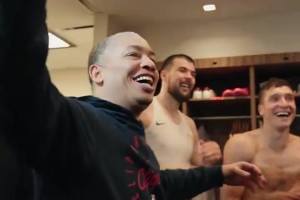 快船赛后更衣室,大伙儿集体庆祝!泰伦-卢笑得太开心了吧!