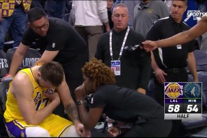 明显胃部不适!半场结束后东契奇回到板凳席,一脸难受🤕