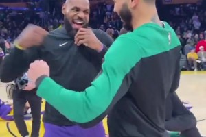 两位全明星首发!詹姆斯与塔图姆赛前拥抱寒暄,老詹表情滑稽🤪