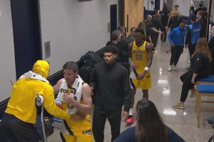 看着揪心😭伤退的哈利伯顿在通道拄着拐等队友们,一一击掌拥抱
