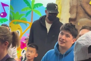 网友遇见易建联带孩子出游,戴着墨镜口罩,但这身高遮不住啊