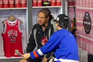 又来蹭饭了?吉诺比利今日来到现场观战,赛前与文班打招呼!