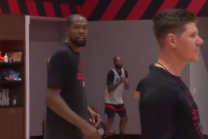 这一身红真顺眼😍杜兰特穿火箭球衣亮相新赛季训练营