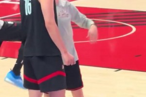 开拓者球迷日,杨瀚森和助教沟通,随后兴奋地开始热身