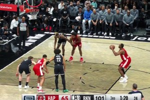 篮网第一场季前赛,曾凡博没有得到出场机会,坐在板凳席角落处