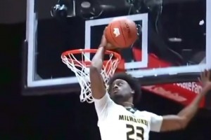 哥们这扣篮也太逆天了吧!头发都要撞倒篮板了