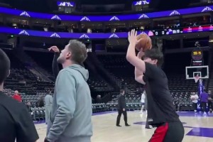 期待今天发挥!在斯普利特指导下,杨瀚森赛前热身猛练小抛投🤩
