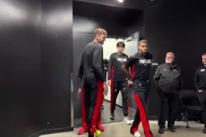 开拓者这赛前动员有流程的~杨瀚森与克林根击掌碰肩,众人围一圈